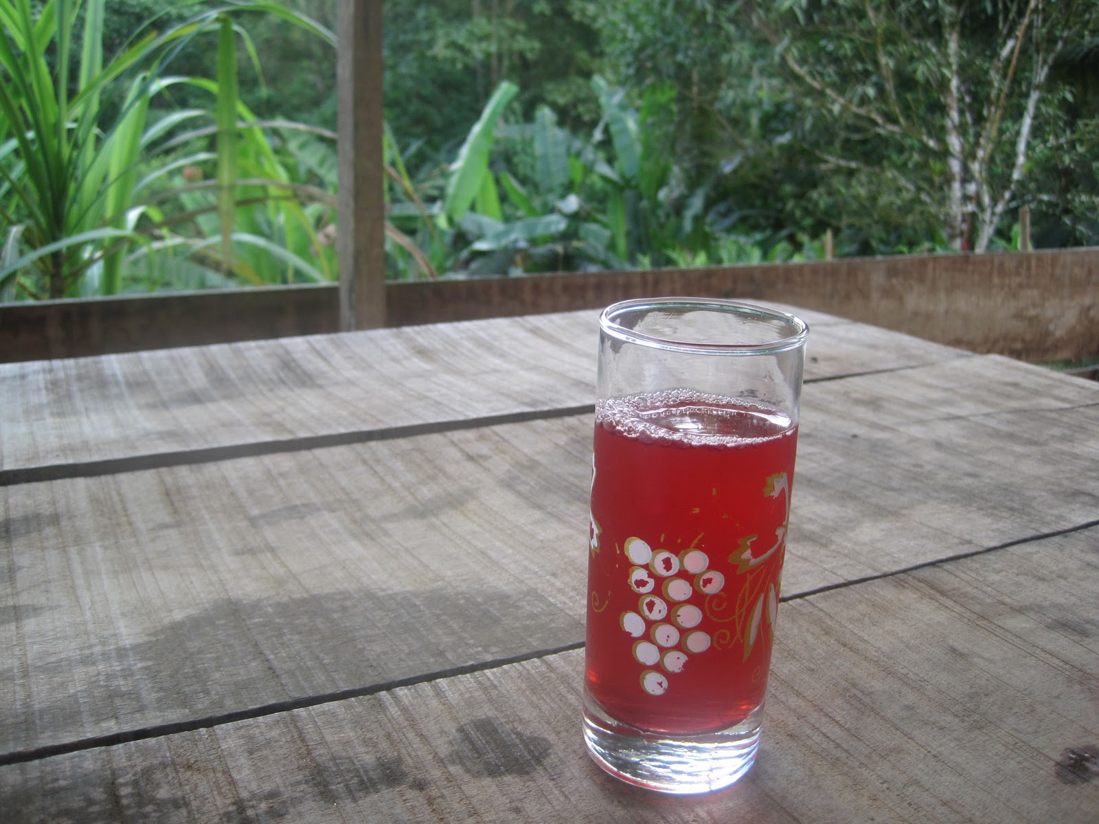 The sun is out and illuminates the wide, light green blades around the sugar cane growing next to the outside kitchen where I sit at the picnic table and write. Clouds and some of the left over morning mist gather at the top of the densely forested hills to my right. They cast shadows adjacent to the sunny patches making a quilt of light and dark on the ridge.The water tank to my left sprouts a mossy growth on its otherwise stark cement base. I drink sorrel punch made from the red sorrel flower. It's magical to me to drink flowers like some giant bee.